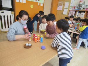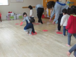 フラットマーカーというものを使って遊びました。表裏の色がそれぞれちがう、オセロのコマのようなものです。子どもチームは赤組、大人チームは白組です。子どもたちは白のフラットマーカーがあれば赤にどんどんひっくりっ返していきます。大人も負けないぞ!とせっせと返していきます。三回戦しましたがすべて子どもたちの勝ち~でした。子どもたちの人数と元気にはかないませんね。勝ちが続いて上機嫌の子どもたちでした。