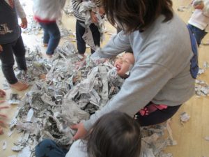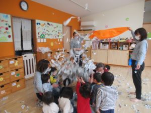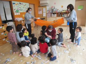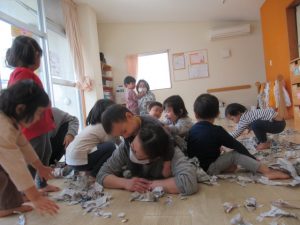 お部屋いっぱいに新聞紙を出してあそびました。雨にしたり雪にしたり、かけあいっこをしたり…最後はお友だちにお布団のようにかけてみたり、思う存分遊びました。最後は収集車やブルドーザーになってお片付けもできました。