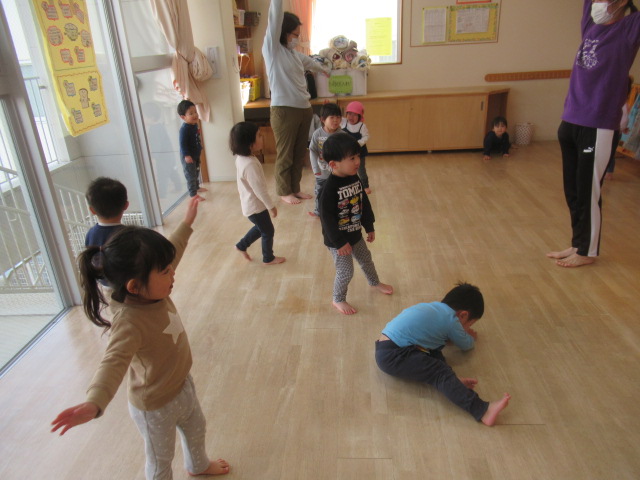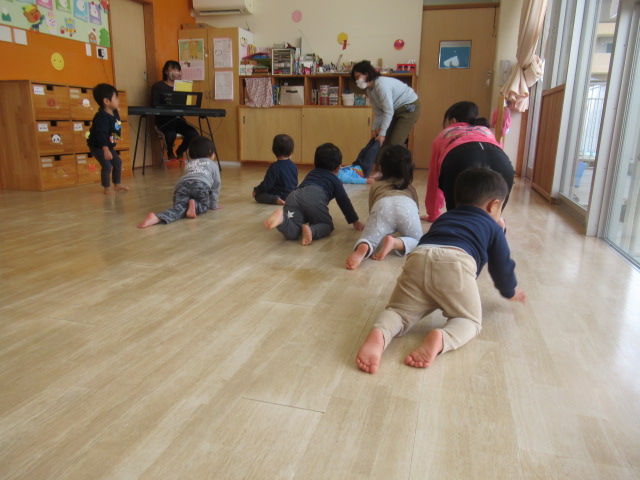 身体を動かして温まろう!と跳ねたり、ハイシーをしてピアノに合わせて遊びました。
