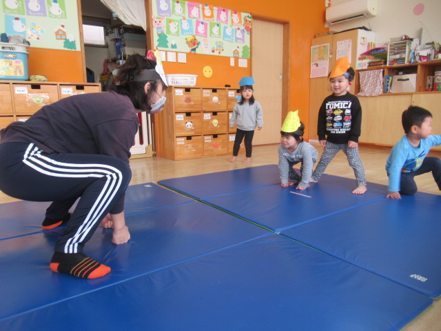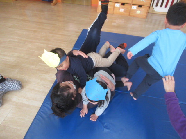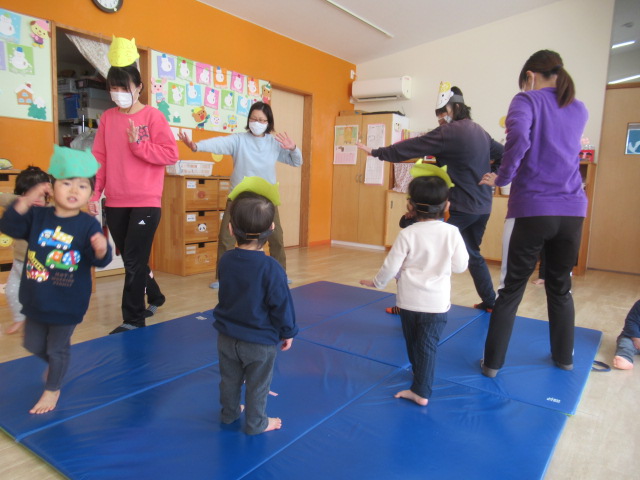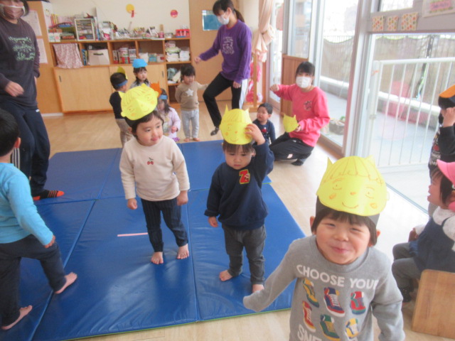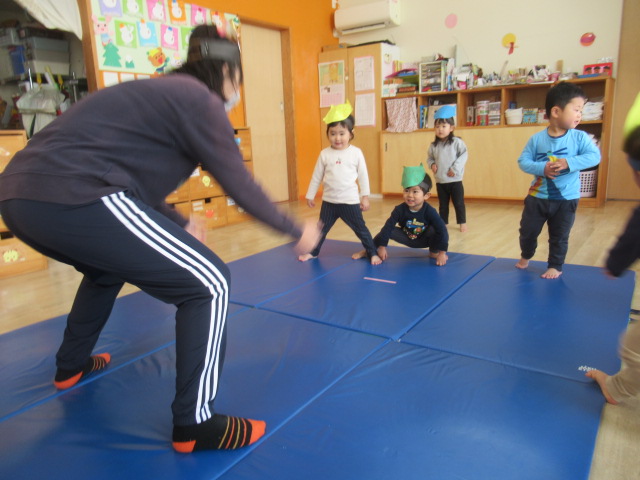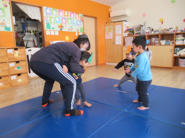 チビ鬼さんに変身して、鬼の様に強くなろう!とお相撲稽古をしました。四股を踏みながらマットの周りを歩いて、その後は保育士とお相撲!「はっけよーい、のこった!」というとキョトンとしていたお友だちもたくさんでしたが、おいでおいでー!と声をかけると力強く飛び込んできてくれました。見事に勝利!ヤッター!!喜びと自信を付けれたかな?応援してくれていたお友だちとも喜び合いました。節分の日もこれで大丈夫!!