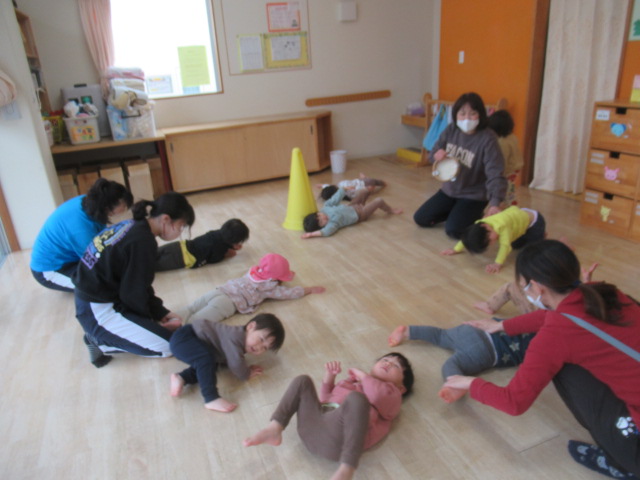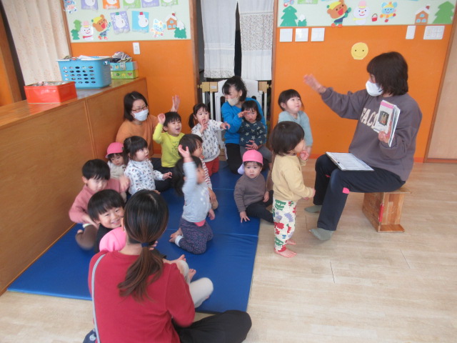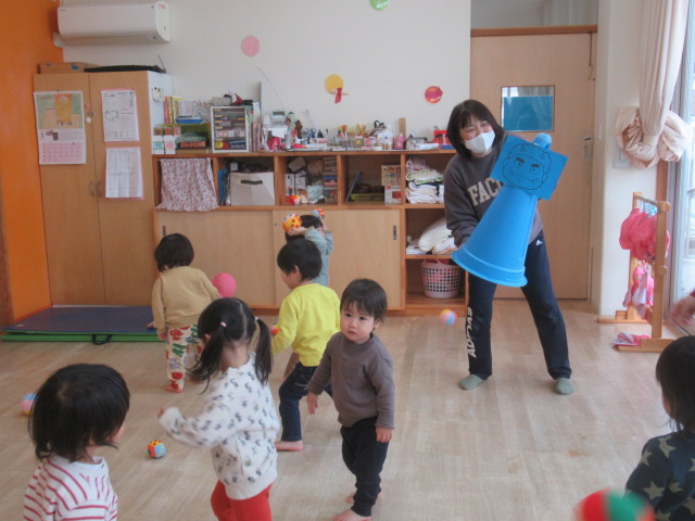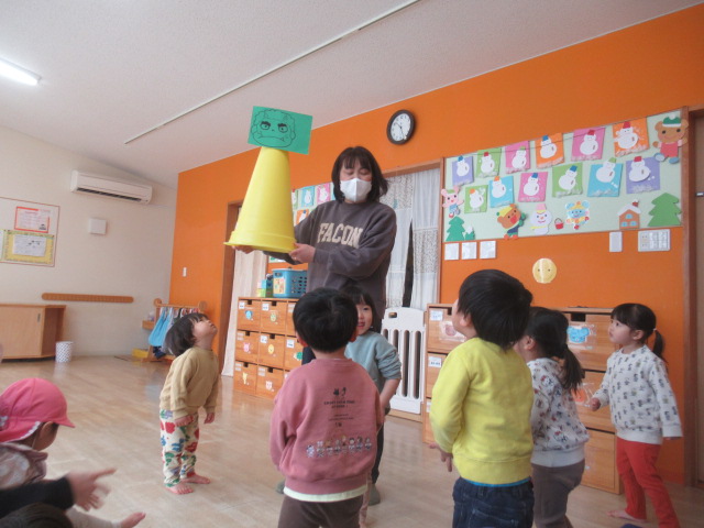 豆の入った手作りマラカスを振って節分の歌をいくつか歌いました。聞いた事のある歌になると張り切ってマラカスを振って楽しんでいましたよ♪