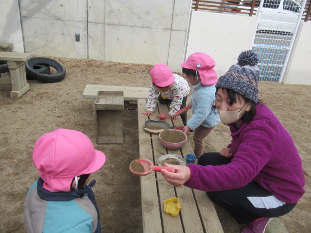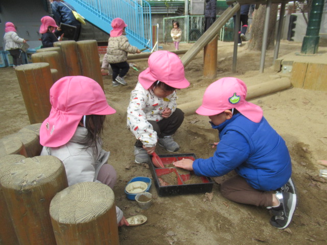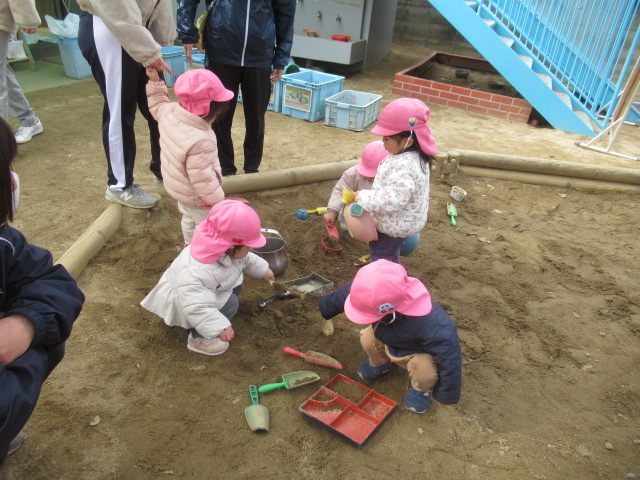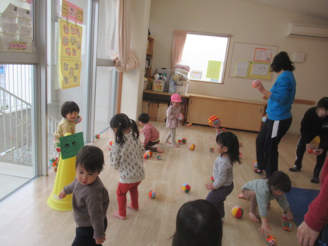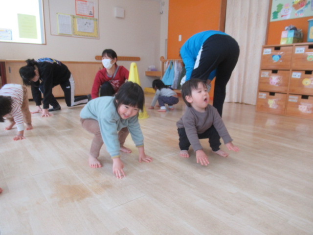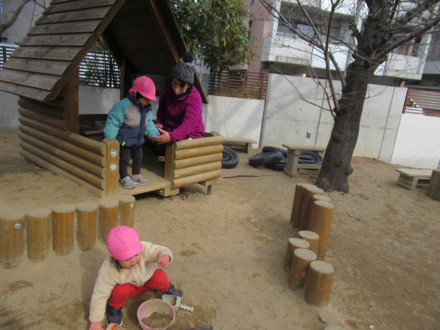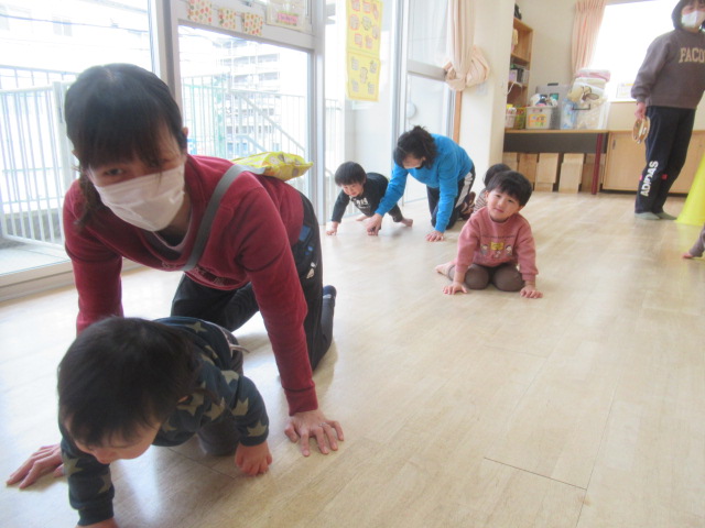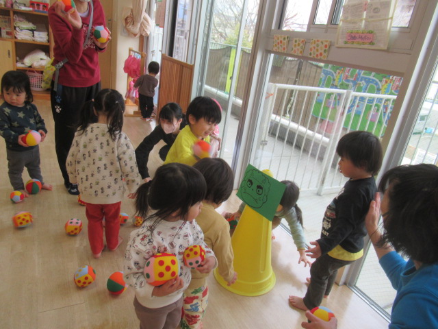 いよいよ明日は節分です。いつ鬼が来てもいいように豆まきの練習をしました。緑鬼、青鬼、赤鬼とやって来る鬼たちに「鬼は~外!」の掛け声と共に豆を投げて追い払いました。鬼が逃げて行くと「やった~!」と飛び跳ねて大喜びしてましたよ。