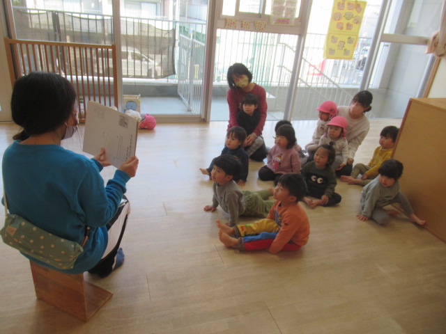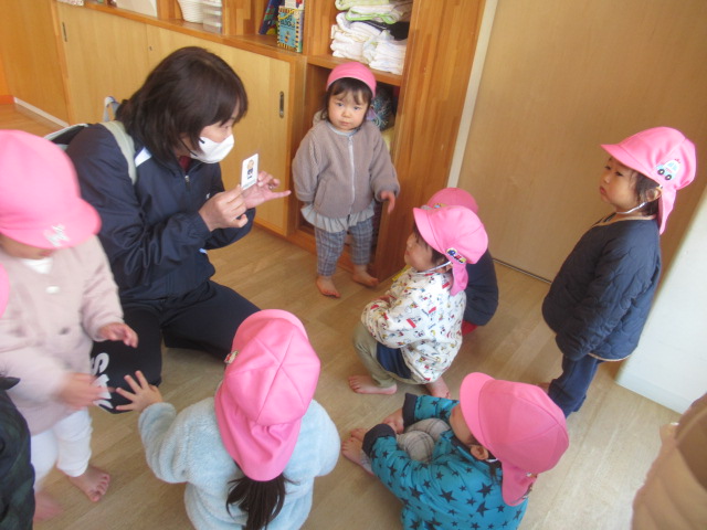 色々な動物がウサギのお家に遊びに来る紙芝居を見ました。誰が来たのかな?とお友達に聞いてみると次々に教えてくれて、みんな真剣な顔で見ていました。