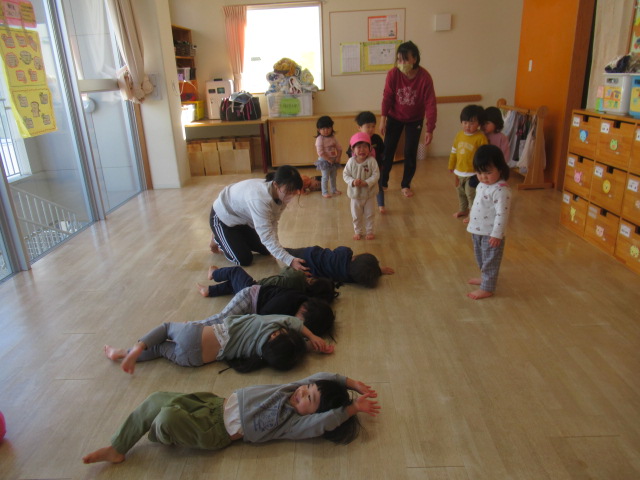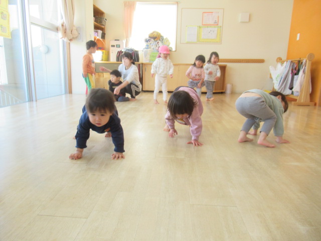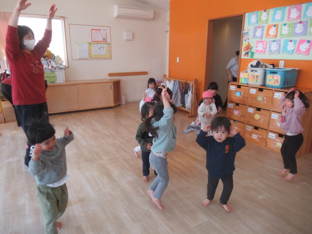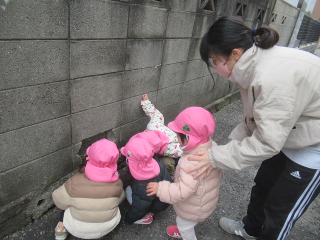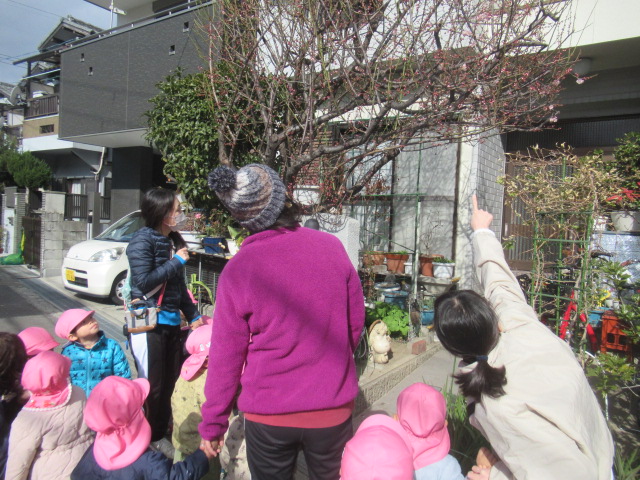 ピアノのリズムに合わせて簡単なリズム遊び。馬になって這い這いしたり、ウサギになって飛んだりして身体を動かしました。そのあと散歩に出かけました。行く途中に咲いていた梅の花を見たり、屋根瓦の鬼が寝ているのを見つけ、みんなで「起きてー!」と起こしたりしながら先に進みました。のぞき穴を見ると素敵な飾りがあり、それを見たお友達が「鬼いなくなったなぁ」と教えてくれました。前に見た鬼の飾りを覚えていて、次に見に来た時に何が飾ってあるか楽しみにしておこうねと話をして帰りました😊