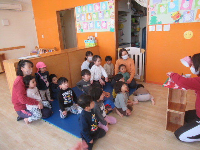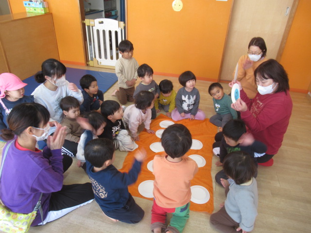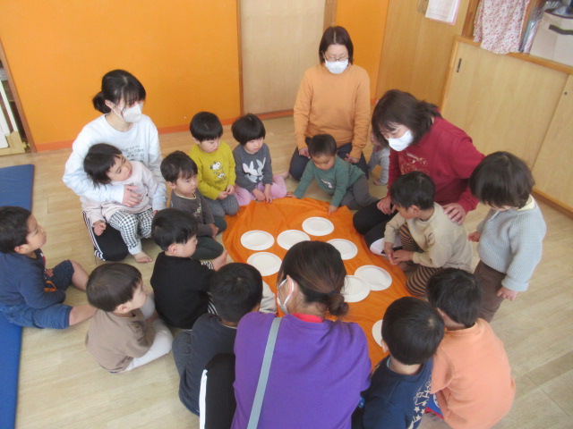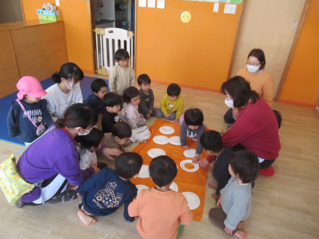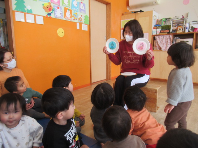 絵本『ひなまつりのちらしずし』を読みました。ちらし寿司を作ったり、雛人形を飾ってお友だちと楽しく過ごすお話です。ちらし寿司の具にも”幸せに育ちます様に”と意味があるんだよと言うお話をして、どんぐりさんでも♪うれしいひなまつりの歌を歌い、手作りの雛人形🎎を見てもらいました。絵本に出てくるハマグリの貝遊びにちなんで、紙皿に2枚ずつ同じ絵を描き、裏返しにして当てっこする遊びをしました。同じ絵が揃うととっても嬉しそうでしたよ^_^