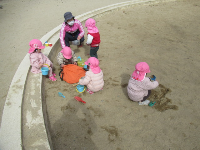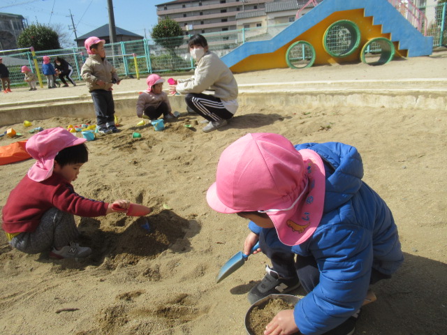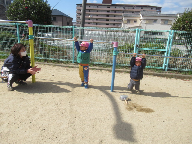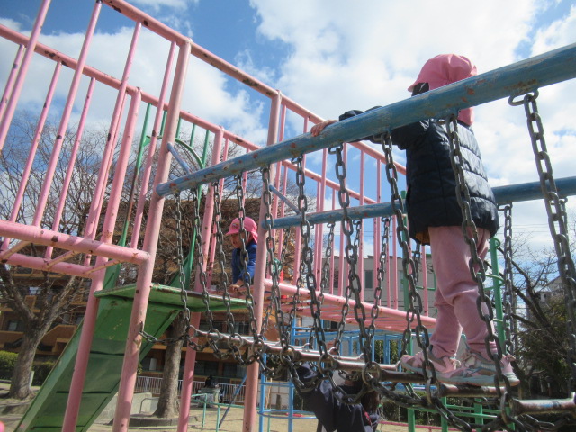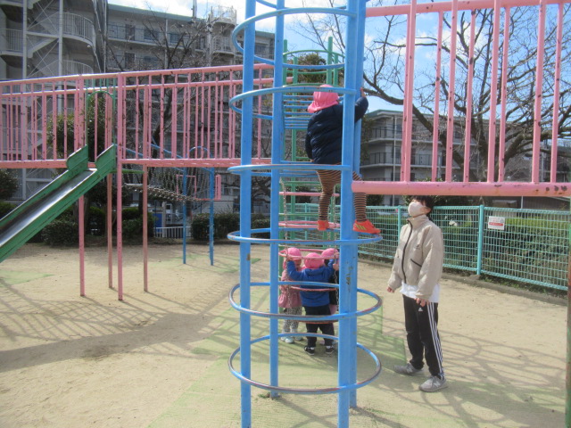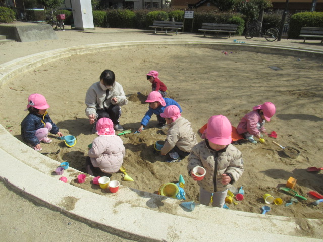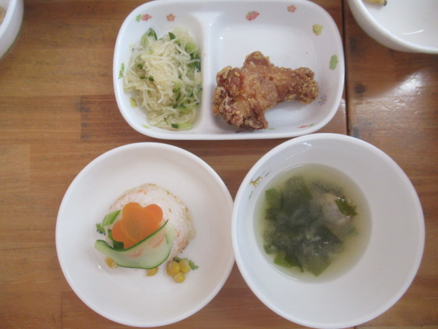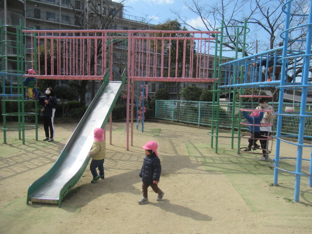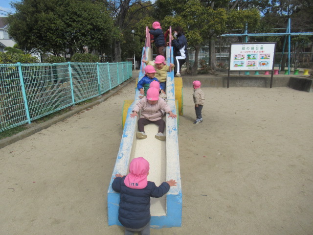 近くの公園までお散歩に行きました。公園に着いて「遊んでいいよ」と声をかけると一目散にそれぞれが好きな場所へと走って行く元気な子どもたち。帰る時に「今日の給食は絵本に出てきたちらし寿司とチキンのご馳走だ〜♪」と楽しみに帰って来ました!