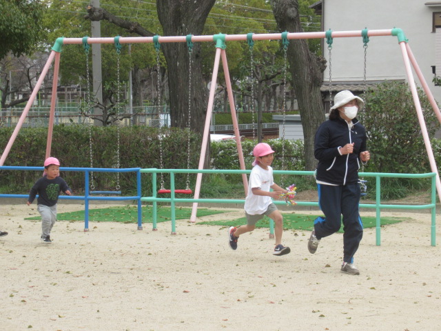 公園でまずはみんなでしっぽ取りをしました。お兄ちゃん達がしっぽを取る役をやってもらい、他のみんなは頑張って取られないように逃げました。あれよあれよと言う間にしっぽを取り、お兄ちゃん達の勝ち!次は負けないぞー!とまだまだやりたいどんぐりさんでした😊その後も追いかけっこや、ブランコ、砂場などたくさん遊びました。