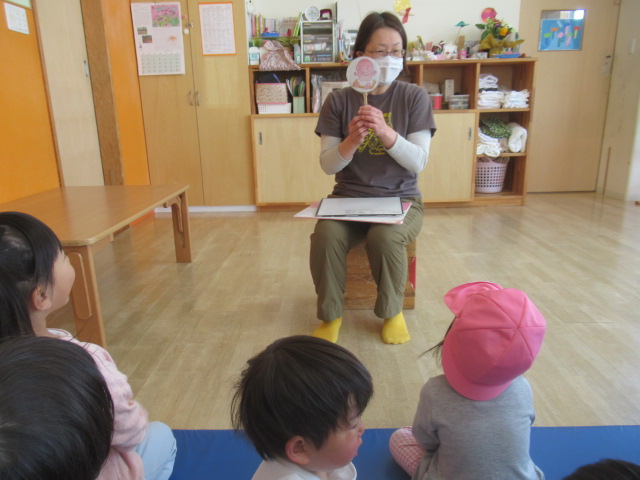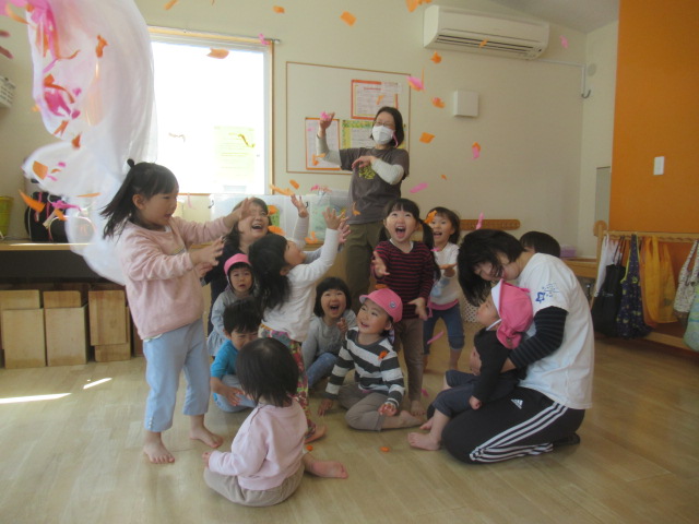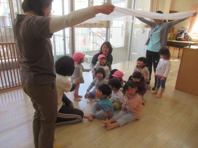 これから新しくお友だちが少しずつ増えてきます。今日も二人お友だちが来てくれました。わらべ歌遊びでオーガンジーの布をゆらゆらさせて遊びました。お花紙を丸めたりちぎったりしてのせると、ひらひら~と舞ってきれいでした。泣いていたお友だちも何かな?と見上げていました。