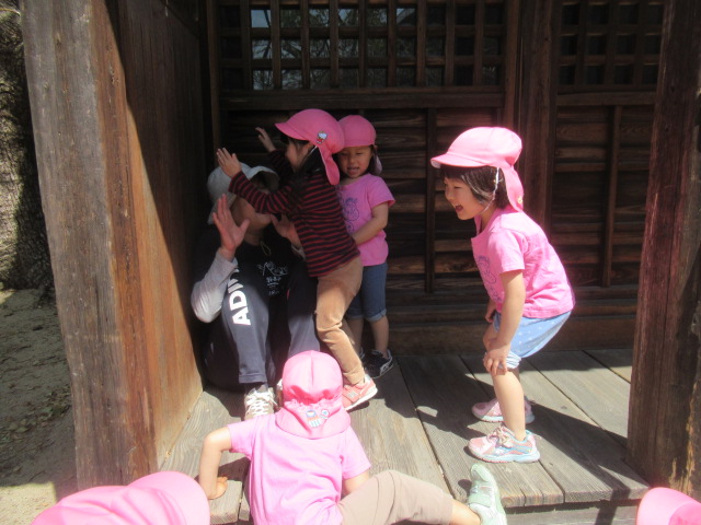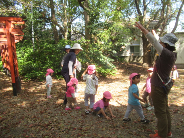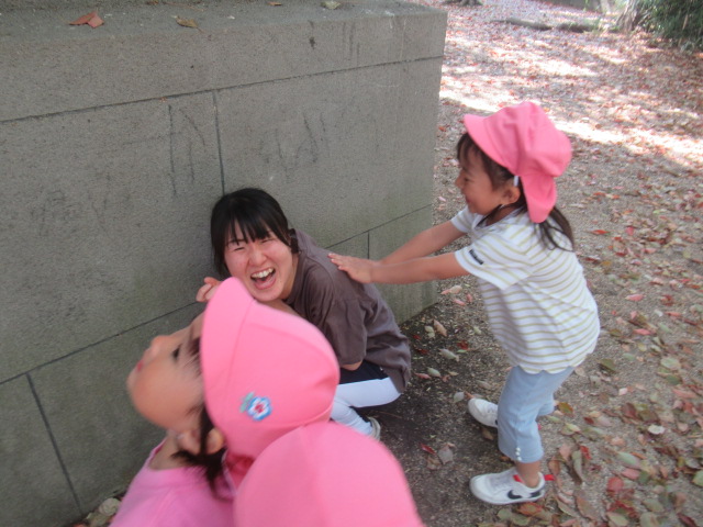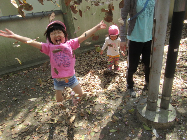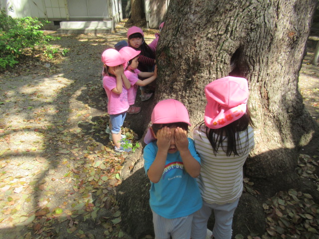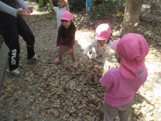 先日の強い風で葉っぱがいっぱい落ちたのか、歩くとカサカサ音がして楽しかったです。はっぱをそれ~っと投げて遊んだり、かくれんぼをしたりして遊びました。かくれんぼは大人が隠れに行くと、気になって気になって、チラチラ見てしまっている子どもたちです。