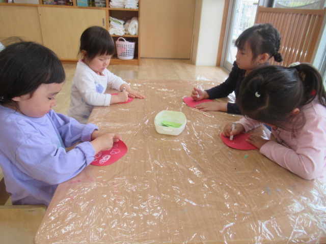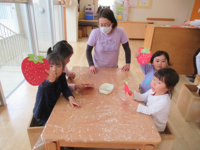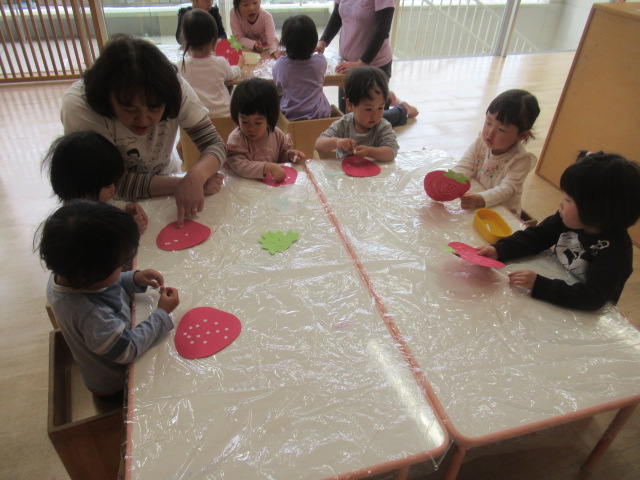 いちごの形の画用紙に、ツブツブをクレパスで描いたり、シールで貼ったりしました。最後に葉っぱをはれば完成です。甘くて美味しそうないちごが出来上がりました😊