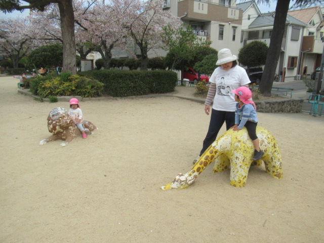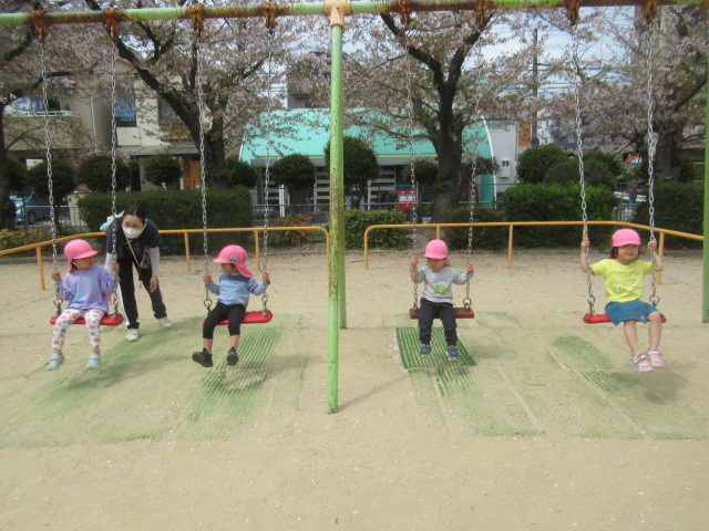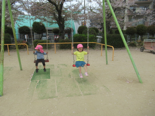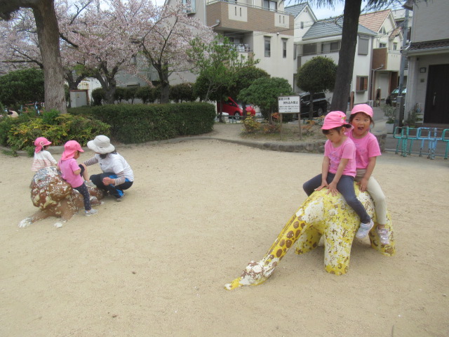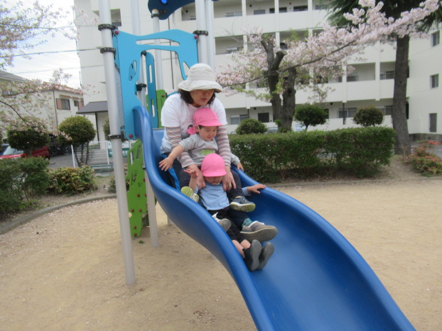 公園へ行きたくさんの桜がヒラヒラと散りゆく中で春を感じながら、すべり台が楽しくて何度も繰り返しすべったりアリを見つけたりと思い思いに遊びました。