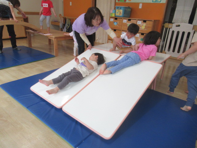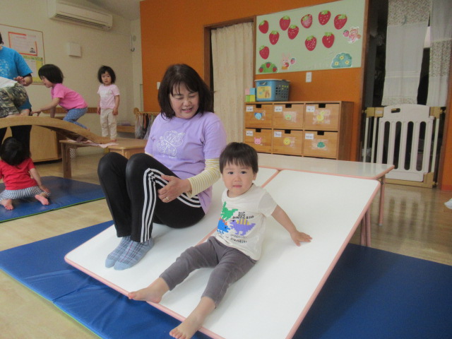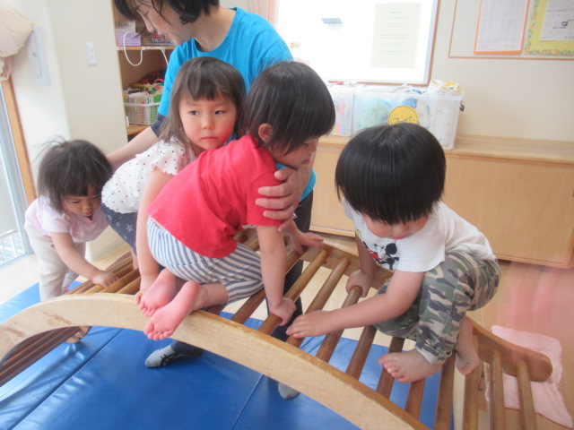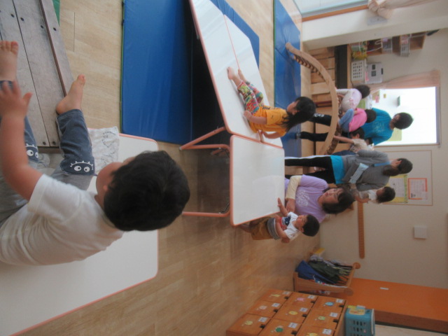 今日はいつもの滑り台、幅の広い滑り台、太鼓橋の3種類を組み立て遊びました!どれにしようかなーと選ぶのも楽しく、こっちもあっちも!とたくさん身体を使って遊びました!階段から登るのではないのでよじ登る時は全身を使って登る全身運動!滑って登って楽しみました!