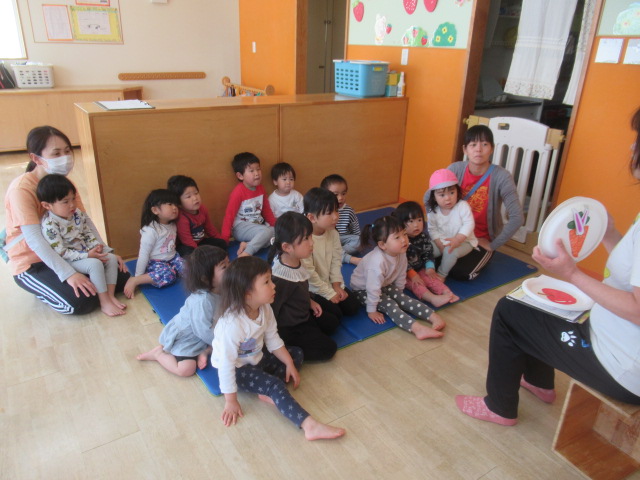 4月の壁面で制作しているいちご🍓 「みんなが作ったいちごは、どれも美味しそうだね〜」とお話すると、いちご狩りに行ったお話や朝に食べてきたよ〜と子どもたちが教えてくれました。いちごが、真っ赤に美味しくなるにはどうしたらいいのかな?そこで絵本『まっかになあれ』を読みました。おひさまにぽかぽか当たって段々と真っ赤になっていくいちごのお話をじっくり聞いていましたよ。