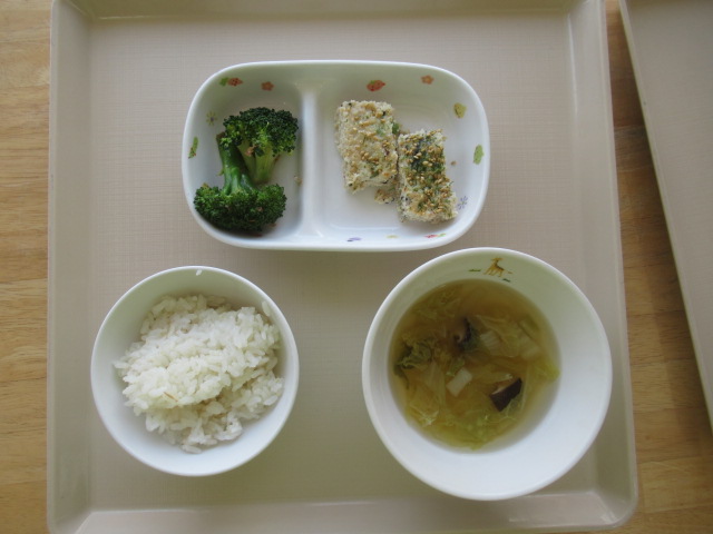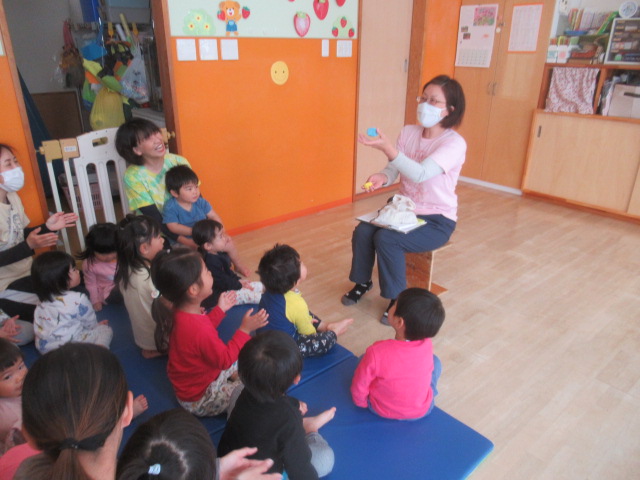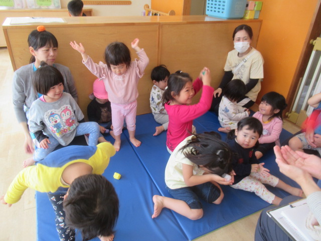 お手玉で遊びました。頭にのせてポトン!と落ちるだけでも楽しい!キャッキャと笑っていました。今度は頭にのせて、手でキャッチしてみようと挑戦しました。できてもできなくても楽しくて、ついつい笑顔になってしまう遊びでした。