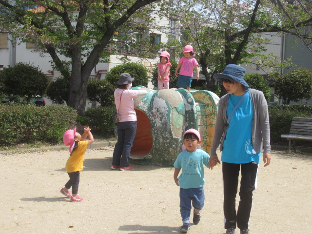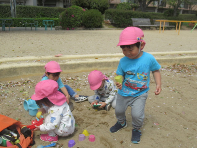 近くの公園へ遊びに行こうと出発。公園まであと少しというところを歩いていると、風で桜の花びらがひらひら~と飛んできました。公園で遊んでいても桜吹雪が吹き、お砂場も花びらがいっぱい。この時期ならではの景色でした。気持ちのいいお天気の中たっぷり遊んできました。