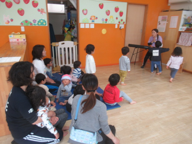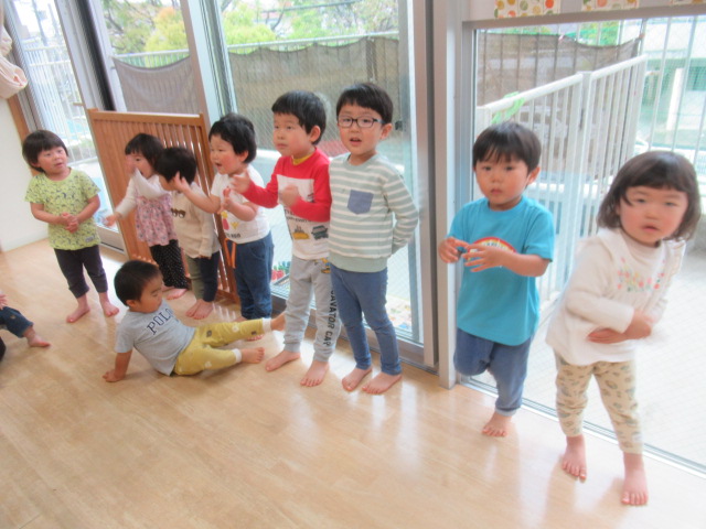 「チューリップ」や「ちょうちょ」など、春の歌をうたいました。それまで泣いていた新しいお友達も、ピアノの音を聞くと体を揺らして笑顔になりました😊「もこ もこもこ」の絵本を読むと、みんな興味津々な顔をして見ていて、“にょきにょき”や“ぱちん”という擬音語を喜んで笑っていました。