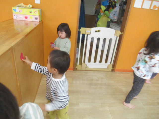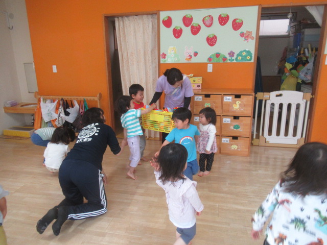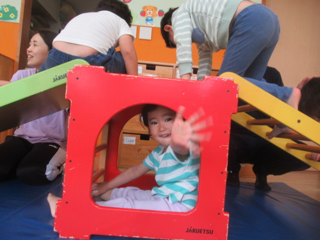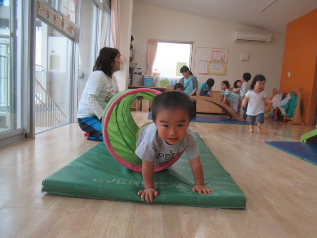 すべり台、太鼓橋、トンネルを使いサーキット遊びをしました。はじめは怖くて出来なかったお友達も見よう見真似でやってみたり、すべり台を繰り返しすべったりと色々な姿が見られました。