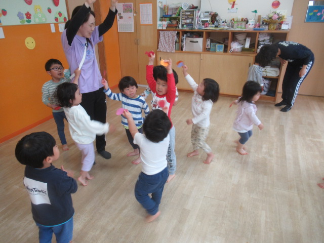 「きんぎょがにげた」の絵本を見ていたら、絵本からきんぎょが飛び出して逃げてしまいました!みんなで、お部屋の中を探してみようと探すとあっという間に逃げたきんぎょを見つけることができました!みんな探すことがとても上手でした。