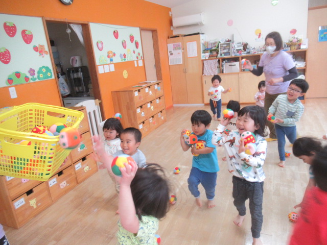 ボールを使って玉入れの真似事をして遊びました。カゴが動くので入れるのが難しかったですが、何度も何度も投げて入るまで頑張っていましたよ。