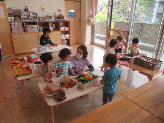 その後にコーナー遊びをしました。子ども達に何をして遊びたいか聞いて、おままごととお人形、電車に決まりました。雨の為外には出られませんでしたが、部屋の中でもしっかりと体を動かして遊びました😊