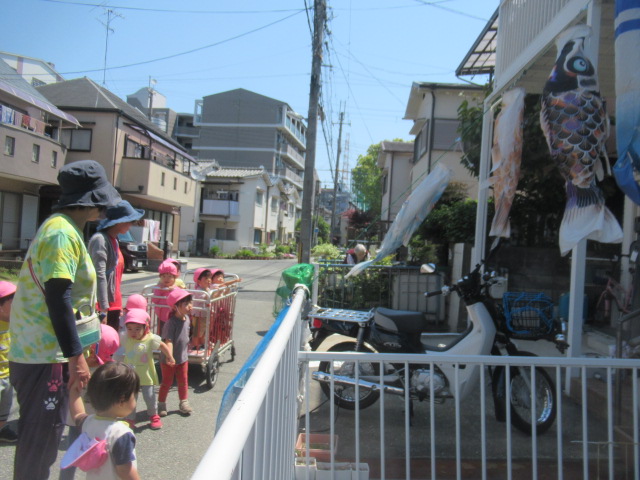 公園に行く道中、鯉のぼりを見に行きました。大きな大きな鯉のぼりに口をあんぐりと開けて「すごいねー!」「ご飯食べてよー」と声を掛けている姿も可愛いかったです^_^