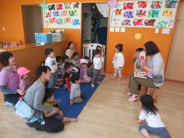 絵本『だるまさんが』のおはなしをペープサートにしたもので遊びました。まねっこ上手などんぐりさんは、だるまさんになれるくらい上手で、とっても楽しそうな様子でしたよ。