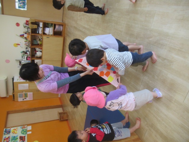 連休前にみんなで作ってお部屋に飾っていたこいのぼり。今日はみんなでおみこしのように「ワッショイ ワッショイ」とこいのぼりさんを運びました。お友だちと一緒にこいのぼりを持って、お互いの顔が見えるのでうれしくなって楽しいひと時でした。