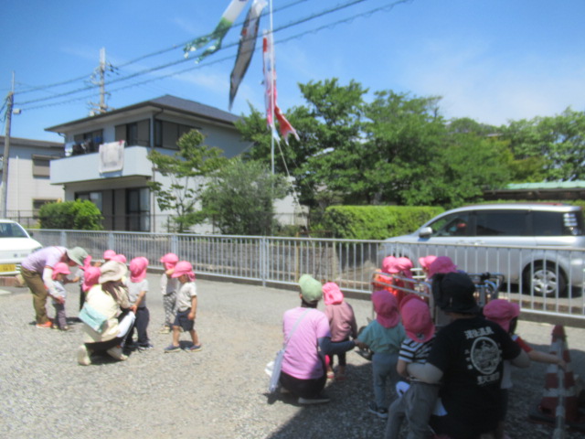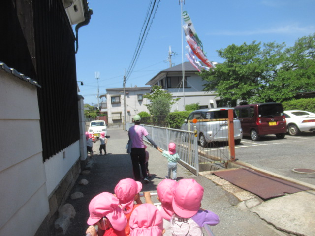 大きいこいのぼりを見に行こうとお散歩へ。途中、散歩中の犬さんに会ったりいちごを見たり、楽しい出来事もありました。こいのぼりの前で歌も歌って楽しんできました。