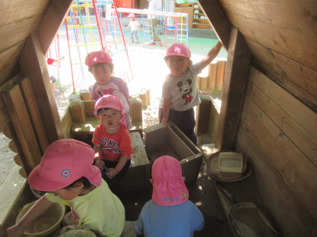 散歩から帰ってきたあとは、園庭で遊びました。木のお家の中がお料理をするお友だちで大賑わいでした。
