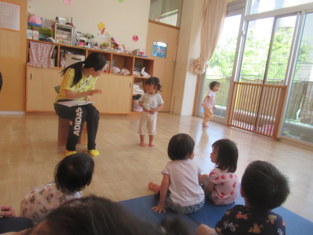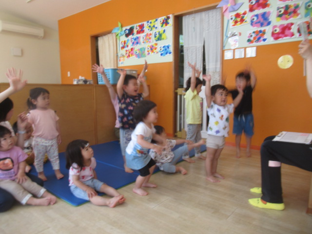 「ぴょーん」という絵本を見ました。みんなジャンプがとっても上手で、絵本を見て真似してみんなでジャンプ!!もう1回したい!と、楽しそうでした。