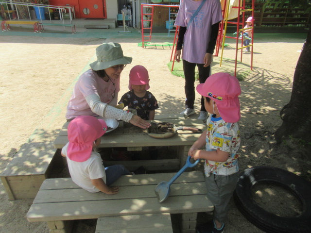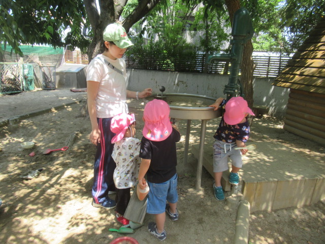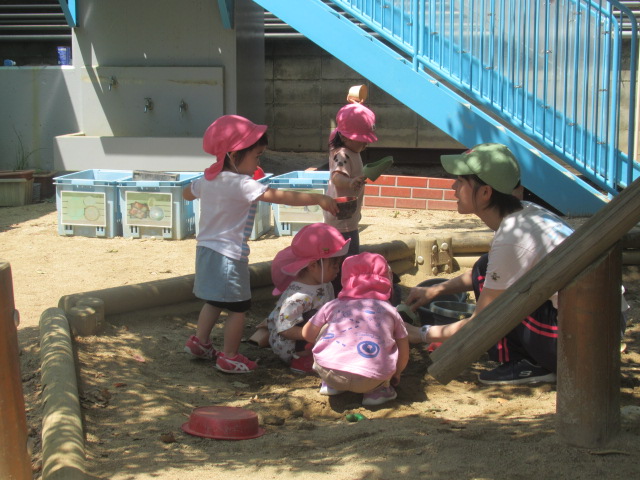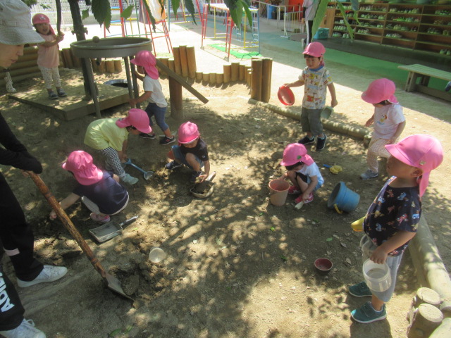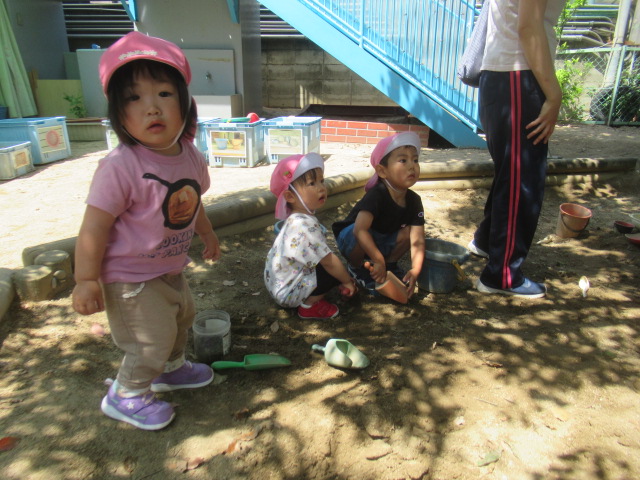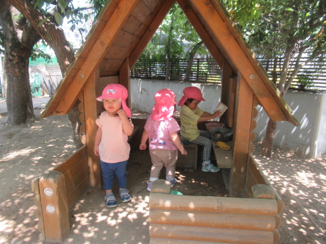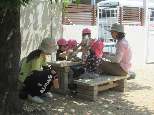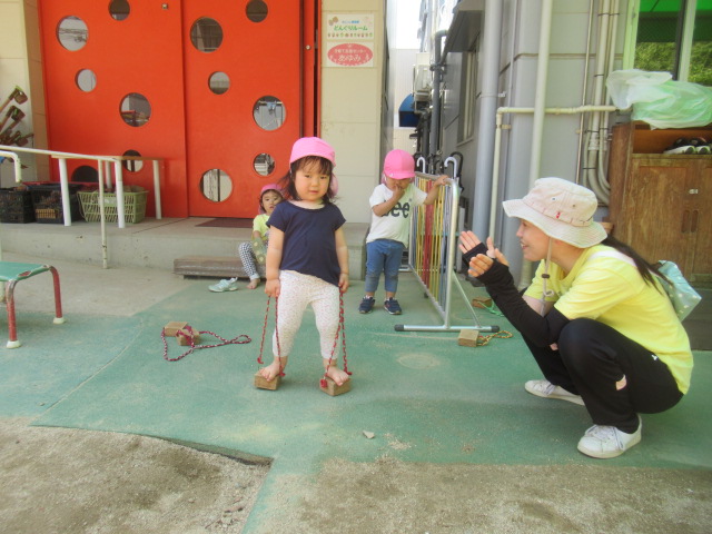 水分補給をしてから園庭に出て遊びました。テーブルのある場所に集まりみんなでご飯を食べたり、ぽっくりをしているお友達を見て初めて挑戦してみたりするお友達もいました!思い思いに外遊びを楽しみました。