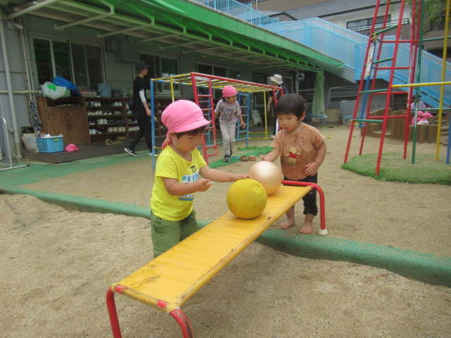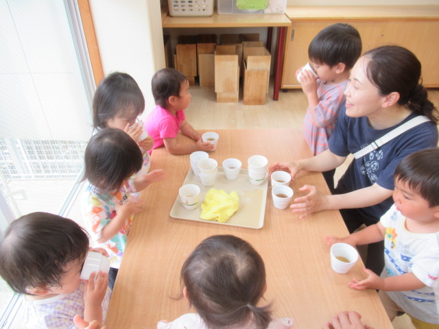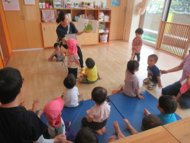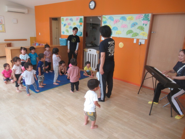 ‘’カエルのうた‘’や‘’かたつむり‘’など季節の歌をうたいました。知らない歌でも、体を揺らしてリズムに乗ったりしていて、みんな歌が大好きです!