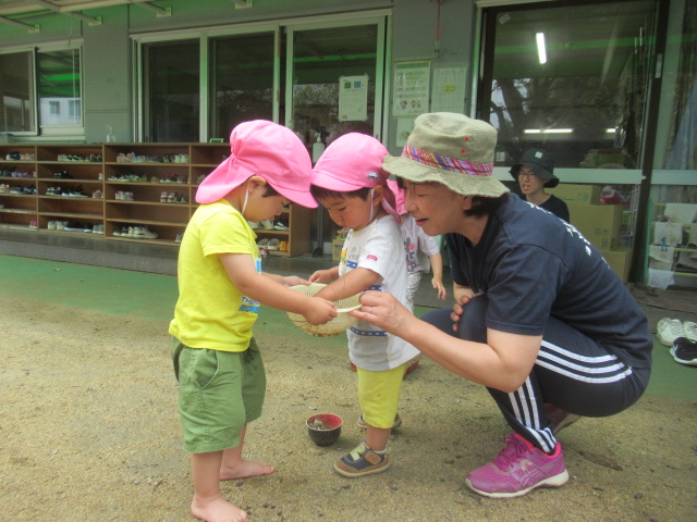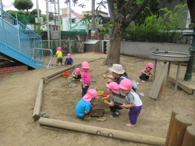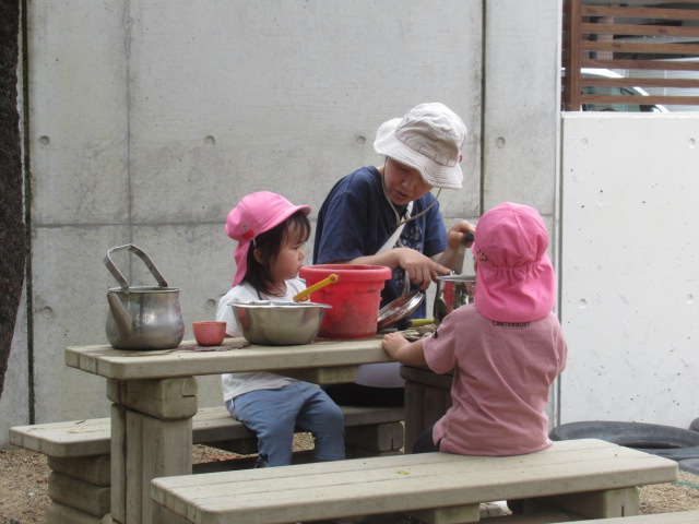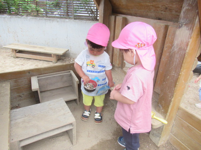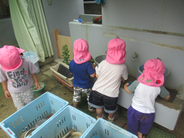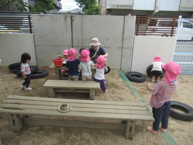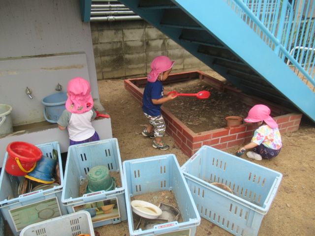 園庭で遊びました。昨日の雨が色々な場所に溜まっているのを見つけたお友達。溜まっているお水をスコップですくってバケツに集めて砂に混ぜ、泥遊びを楽しみました。握ったどこんこをおにぎりや焼きそばに見立てて、お店屋さんなどのごっこ遊びも盛り上がりましたよ!泥で汚れた服は水洗いしています。帽子も汚れているお子さんもいますので忘れずにお持ち帰りください。