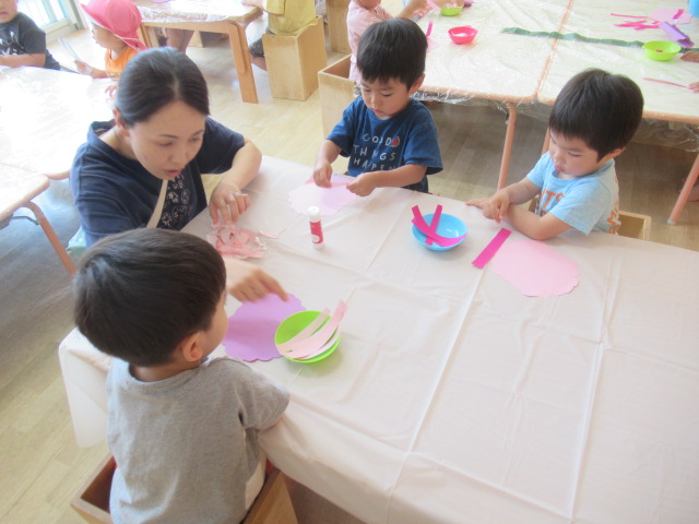 細く切って、ちぎりやすくした折り紙を用意して貼り絵をしました。最初はどうやるのかわからなかったお友だちも、ちぎって見せたり、切目を入れたりしました。すると取り組みやすくなったようでした。作ったのはお散歩でよく見ていたあじさいです。出来上がって窓に貼ってみるととてもきれいでしたよ。