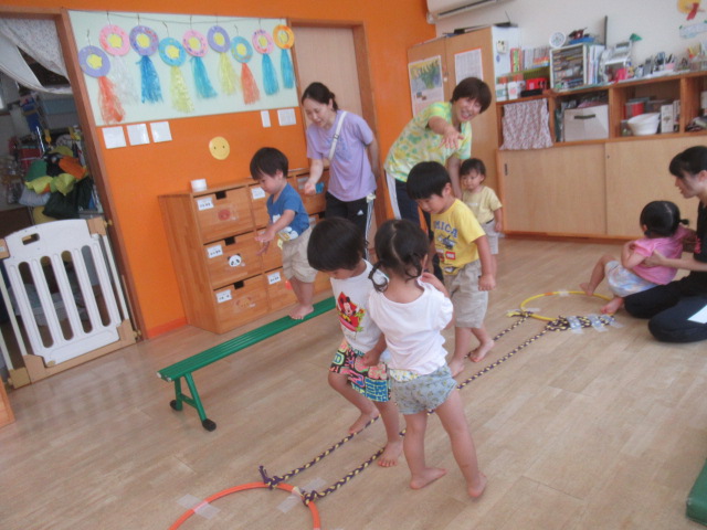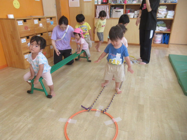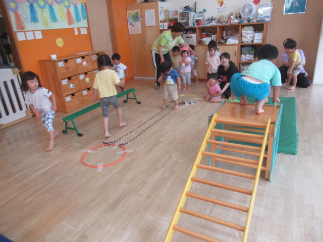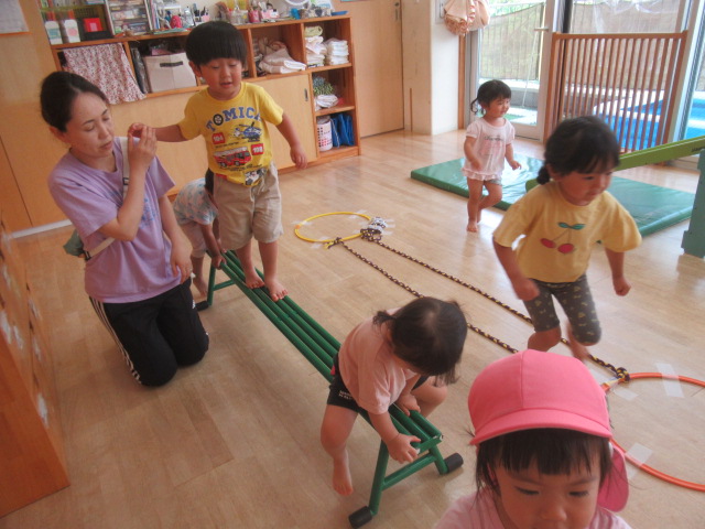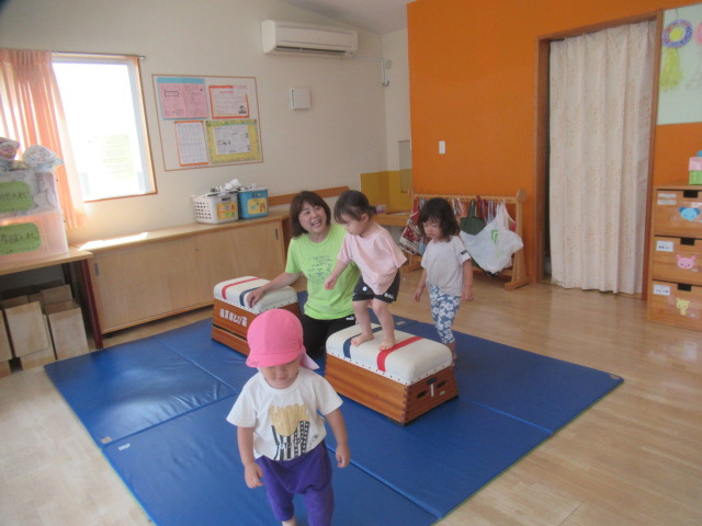 色んなコーナーを作りました。[①平均台とロープ②1段跳び箱と2段跳び箱③滑り台]コーナーごとの約束を伝えて最初は順番にスタートをして、その後は好きな所でたくさん身体を動かして遊びました!①の平均台ではバランスをとりながら歩いたり、座って手を使って前に進んだりしてもOK!ロープの方は、ロープの上でも間でも、跨いでも、グーパーしながら進んでもOK!②の跳び箱は1段目からはジャンプしてもOK!2段目は登って降りる。約束を守る事が難しい場面もありましたが、何度も繰り返し遊んでいるとお友だちに「違うよ」と教えてもらい、気が付いていました^_^集団だからこそのルールもあるので、少しずつ身に付いていけると思います^_^