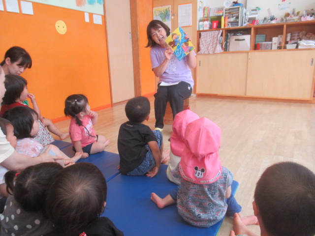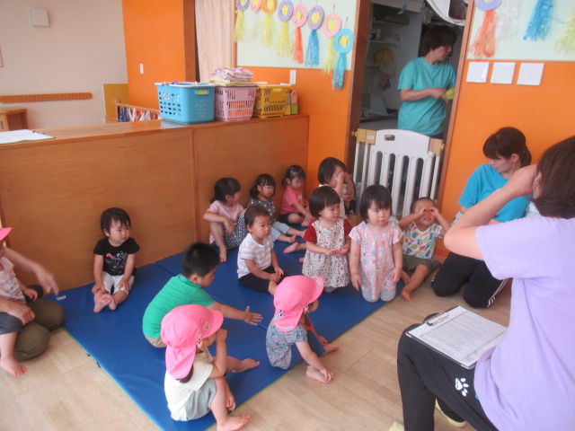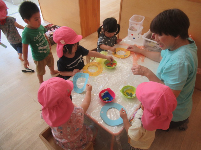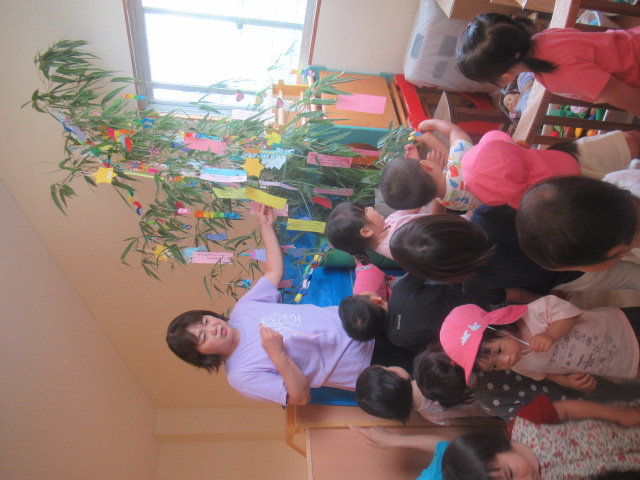 7月の壁面制作でお星さまの飾りを作ったり、お家の人と一緒に短冊🎋に書いた願い事を紹介しながらパネルシアターで『たなばたものがたり』をして七夕についてお話しました。みんなの願い事が叶うといいな〜♪