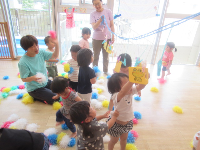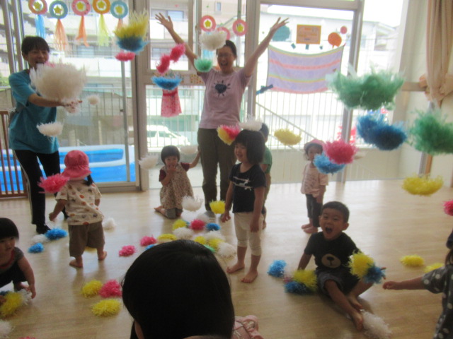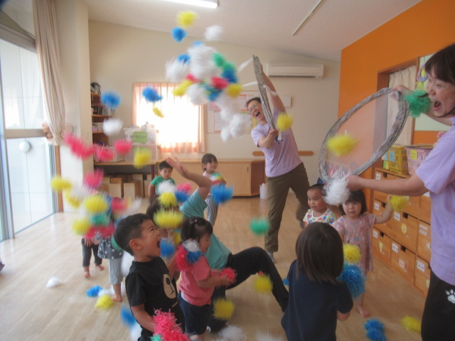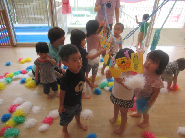 ポンポンを高〜く上げてみたり、絵が描かれた的を狙って当てっこしたりして遊びました。たくさん集めたポンポンをこぼして見せると大喜びでもう一回!と楽しんでいましたよ。