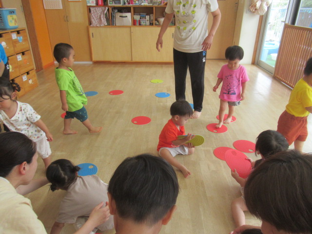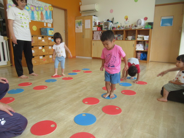 フラットマーカーを使ってルールのある遊びをしました。青色はグー、赤色はパーの足でケンケンパーをしてみました。足を揃えたり開いたりしながら前進するのは難しいですが、子どもたちはリズムに乗って頑張っていましたよ。その後は、保育士と子どもたちに分かれて巨大オセロ大会をして遊びました。