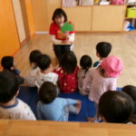 <朝のお集まり> 明日から幼稚園に入園するお友だちを紹介しました。 いつもは元気なお友だちも前に呼ばれると、少し照れていましたよ。 みんな同じ幼稚園!どんぐりからの仲間がたくさんいてるから…