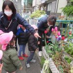 <♪風船ルルル~> ペープサートで見え隠れしている絵を当てっこしました。色に興味を持っているお友だちもいるので、色を答えて満足、描いてある絵が当たって満足と楽しめました。 <雨上りのぶらぶら散歩> 雨…