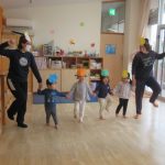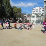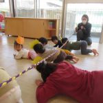 <鬼の三きょうだい> 簡単な決まりのある遊び「鬼の三きょうだい」をやってみました。今日のルールは、鬼役が五数えている間に子どもたちは鬼の手のトンネルをくぐって捕まらないように反対側へ逃げるというもので…