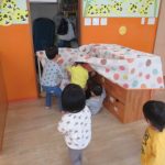 <おしくらまんじゅう> “おしくらまんじゅう”という絵本を見ました。短く繰り返しの内容なので、見やすくてみんなが大好きな絵本です。座ってじっくり見ていました😊 <買い物ごっこ> カバンを持って八百屋さ…