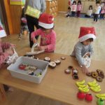 <もうすぐクリスマス> シール貼りをしてクリスマスツリーの形に切った色画用紙を飾り付けました。大きいマルや小さいマル、いろんな色、柄のシールを自由に貼りました。裏も表も楽しんで貼ったお友だちもいます。…