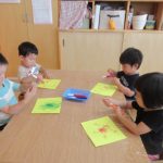 <あたり~!> 丸い布の小さいボールのようなものを紙で包んでキャンディーのようにしました。赤、青、黄色、黄緑などいろんな色があります。黄緑が出たら当たり~!にしました。〇〇色だねーと教えてくれたり、お…