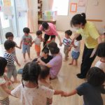 <今日も元気いっぱい> 朝から元気いっぱいのどんぐりのお友達。お集まりの前に、カエルの歌とリズム体操のうさぎのジャンプで体を動かしてひと汗かきました。早寝早起き、そして朝ご飯をしっかり食べてきてくれて…