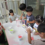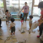 <9月の製作> まだまだ暑いですが、9月になりました。子どもたちがよく知っているりんごやぶどう、みかんなどがおいしくなる季節がやってきます。今日は好きな果物を選んで、細く切った紙をちぎってはりつけて、…