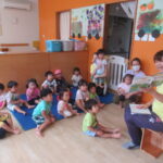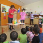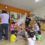 <トントントン> お集まりで「トントントン」というスケッチブックシアターを見ました。いろんな色のドアをトントンとノックするとうさぎやカエル、ライオン等いろんな動物が出てきます。ドアに付いている小窓から…