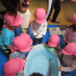 <だんごむしはいるかな?> 『だんごむしのころちゃん』という紙芝居を見ました。だんごむしは石の下がお家で、お友だちと石の下を探したらだんごむしがいるかな?また探してみようねと、話をしました。 <お外で…