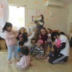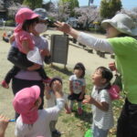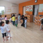 <元気でね~> 幼稚園や小学校に行くため今日でどんぐりルーム最終日のお友だちがいたので、みんなの前で紹介しました。照れくさそうに前に並んでくれました。元気でね。 <みんなで遊んだね> オーガンジーの布…