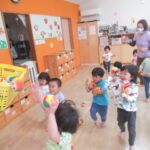<お手玉で あそぼう> お手玉で遊びました。頭にのせてポトン!と落ちるだけでも楽しい!キャッキャと笑っていました。今度は頭にのせて、手でキャッチしてみようと挑戦しました。できてもできなくても楽しくて、…